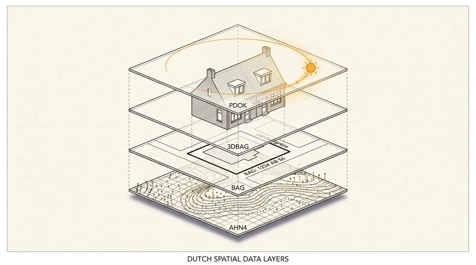 De combinatie is geen toeval. Ze zijn specifiek ontworpen om samen te werken: BAG levert de exacte perceelgrens en pand-ID, 3DBAG voegt het 3D-volume met dakvorm toe, AHN4 vult het maaiveld in, en PDOK verbindt het geheel aan een Nederlands adres. Alle vier gebruiken hetzelfde coördinaatstelsel (Rijksdriehoekstelsel, EPSG:28992), wat de projectie zonder conversie-afwijkingen mogelijk maakt. Dat is precies het type datastapel waarop ook HoeveelZon, DGMR en Peutz hun bezonningsstudies baseren.